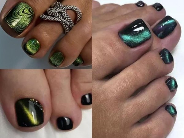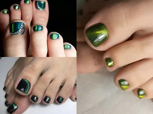 Móng chân màu xanh rêu mắt mèo mang một sự quyến rũ và lạ mắt cho các nàng. Màu sơn mắt mèo có phủ lớp nhũ để bề mặt nail sáng long lanh như mắt mèo, điều này vừa giúp bạn thêm sang trọng vừa tăng tính thẩm mỹ cho bộ móng của nàng. Đây là một trong những mẫu móng chân đẹp màu xanh rêu vừa xuất hiện đã hot trend và trở thành lựa chọn hàng đầu của phái đẹp.