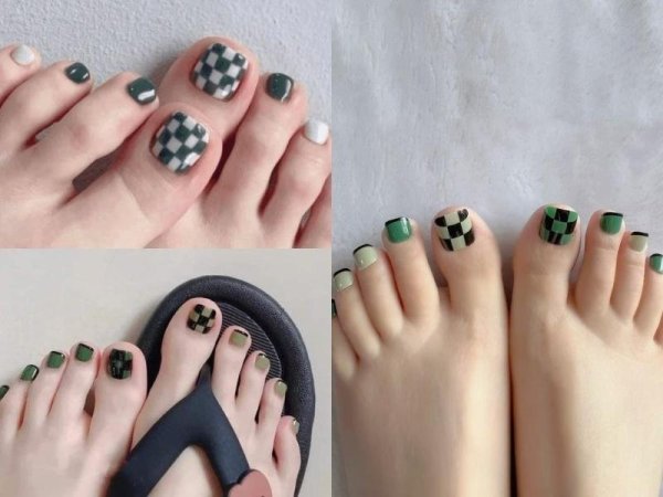 Móng chân đẹp màu xanh rêu kẻ caro có nhiều biến hóa đa dạng (Nguồn: Lục Diệu Linh, enail.vn, Cheese