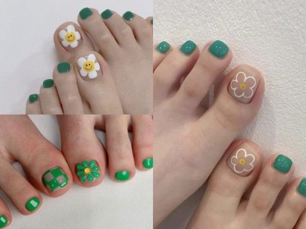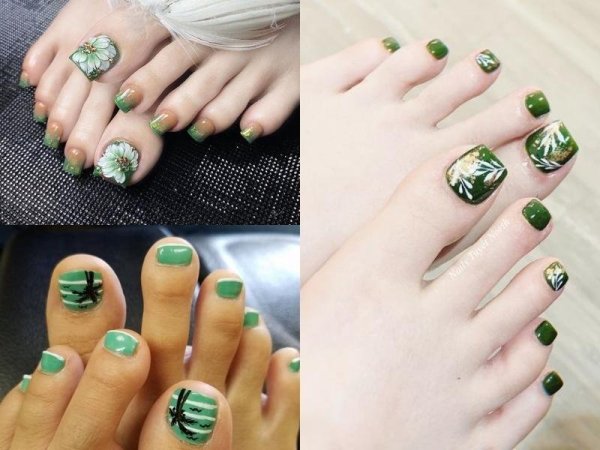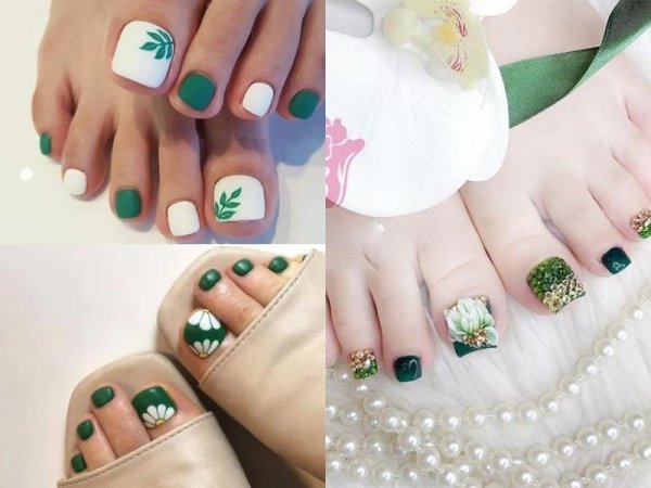 Móng chân màu xanh rêu có hoa lá vô cùng phù hợp (Nguồn: vi.alongwalker.co, kynguyenlamdep.com, seoulacademy.edu.vn) Móng chân màu xanh rêu có họa tiết hoa dịu dàng (Nguồn: yody.vn, seoulacademy.edu.vn, coedo.com.vn)Móng chân màu xanh rêu phá cách
