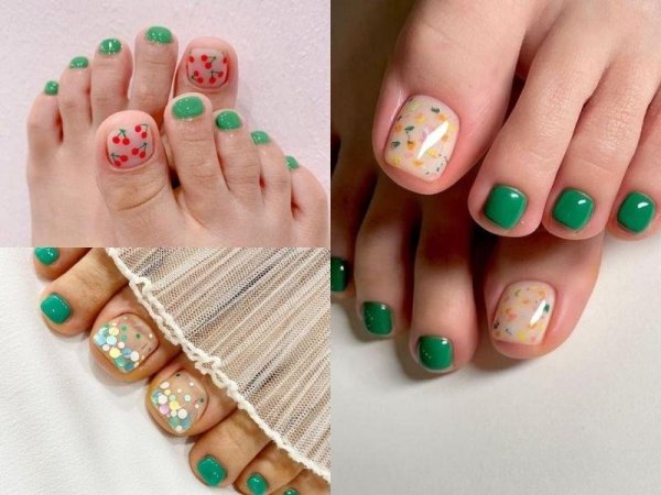Móng chân màu xanh rêu trái cây đáng yêu cho các nàng (Nguồn: Gabriela Foteva, ahkah k, itnail.jp) Móng chân màu xanh rêu trái cây rất phù hợp cho những nàng muốn tìm một bộ móng đáng yêu và mới lạ (Nguồn: www.amazon.com, stayglam.com, naildesignsjournal.com)Móng chân xanh rêu họa tiết hoa lá