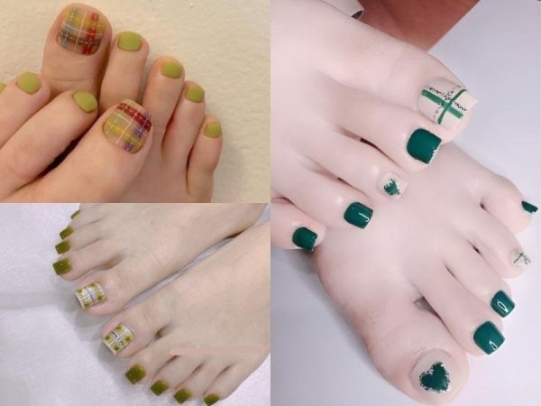 Móng chân màu xanh rêu kẻ caro là một kiểu nail rất được các bạn nữ yêu thích bởi vì các ô vuông caro có thể được biến hóa đa dạng. Các bạn có thể vẽ các ô vuông thẳng hàng hoặc các ô vuông có gợn sóng. Bạn cũng có thể đính kèm lên móng những hạt đá cườm, hoặc vẽ lên các họa tiết hoa, lá, trái tim để nail của mình thêm phần cuốn hút và đặc sắc hơn.
