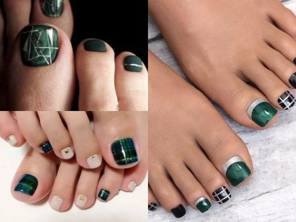 Móng chân màu xanh rêu rất phù hợp với các nàng da ngăm (Nguồn: yody.vn) Móng chân có họa tiết màu xanh rêu cho các nàng da ngăm (Nguồn: Utsav Khandait, irina_visart, Byrdie)Móng chân màu xanh rêu xen kẽ họa tiết kẻ sọc