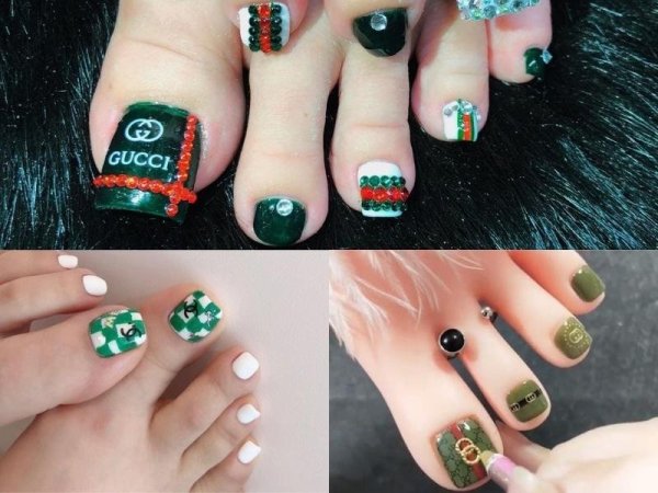 Móng chân màu xanh rêu kết hợp Gucci là một kiểu móng lạ mắt và rất trendy cho các bạn nữ. Mẫu móng này có rất nhiều biến hóa, như dùng màu xanh rêu vẽ biểu tượng Gucci lên móng, hoặc dùng sơn màu đen vẽ biểu tượng Gucci lên nền móng màu xanh rêu. Bạn có thể tự do kết hợp nhiều màu sắc lại để tạo ra một mẫu móng chân đẹp màu xanh rêu nhé.