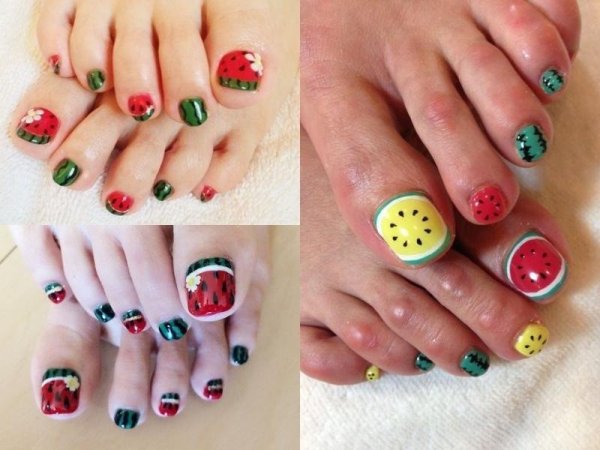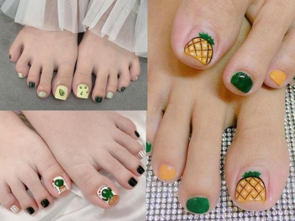 Nếu bạn đang muốn tìm một bộ móng màu xanh rêu và bộ móng đó phải dễ thương thì mẫu móng xanh rêu họa tiết trái cây sẽ là lựa chọn vô cùng phù hợp. Hãy sơn móng chân màu xanh rêu như một lớp nền trước, sau đó bạn có thể tự do vẽ những loại trái cây mình yêu thích lên, có thể là dưa hấu, dây tây, táo… Một mẹo nhỏ để giữ móng đẹp hơn là hãy sơn top coat lên móng sau khi hoàn thiện để màu móng được bền và ít bị phai.