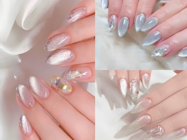 Nail mắt mèo trắng. (Nguồn: Hani Ngọc – Pinterest) Nail mắt mèo trắng độc đáo. (Nguồn: MONA NAIL – Pinterest)Nail thạch trắng