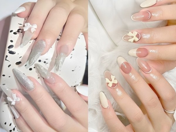 Nail trắng xinh xắn. (Nguồn: Kbeauty Addiction | Beauty & Lifestyle – Pinterest) Nail trắng xinh xắn cho nữ. (Nguồn: Noodle – Pinterest)Nail nơ trắng hoạ tiết dễ thương