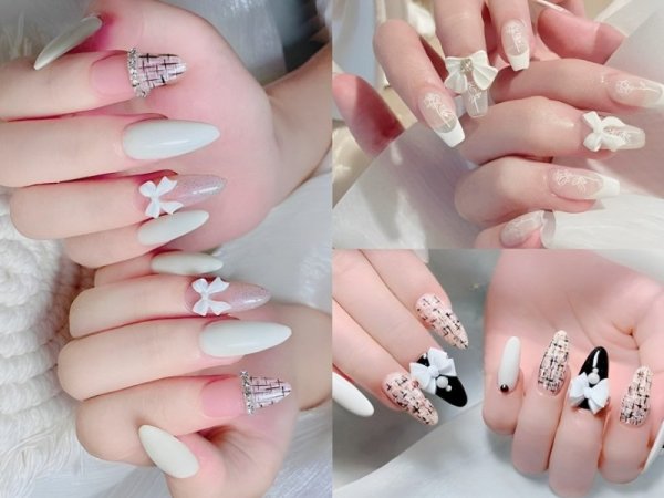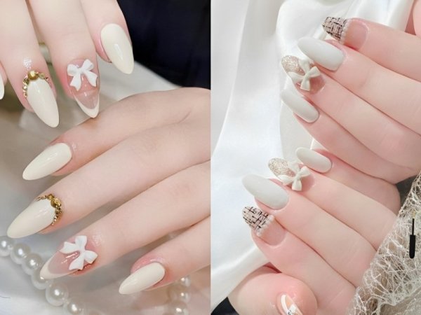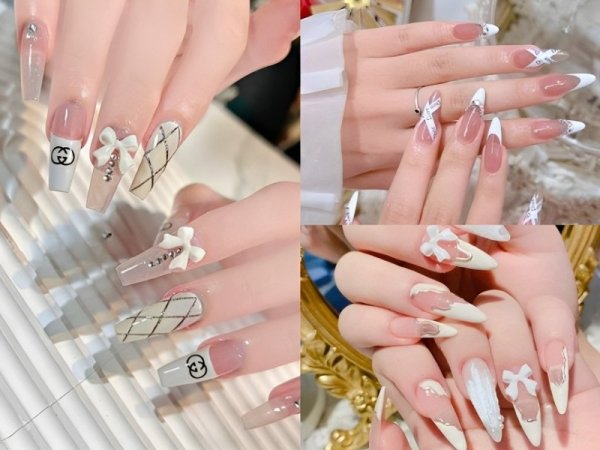 Nail trắng đính kèm nơ. (Nguồn: myhiendayy – Pinterest) Nail trắng được đính nơ cho nữ. (Nguồn: 𝓣𝓱𝓾𝓗𝓪̀.𝓷𝓪𝓲𝓵𝓼 – Pinterest) Nail trắng được đính nơ đẹp. (Nguồn: Springgazee – Pinterest)Nail viền trắng