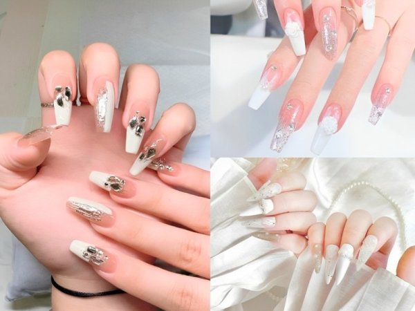Nail trắng đính đá. (Nguồn: Buttercup Nails – Pinterest) Nail trắng đính đá lấp lánh. (Nguồn: tâm tâm – Pinterest)Nail trắng đen