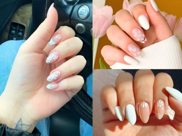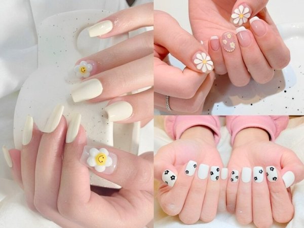Nail trắng hoa nhí. (Nguồn: Moonnnnn_1712 – Pinterest) Nail trắng hoa nhí đáng yêu. (Nguồn: Kimngan – Pinterest)Nail màu trắng trắng nhũ
