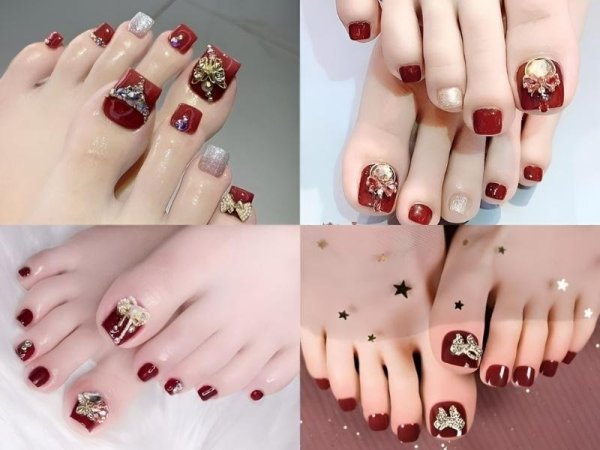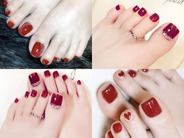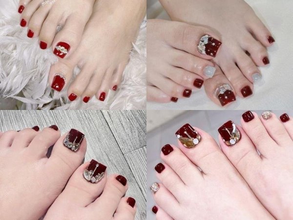 Mẫu sơn gel chân màu đỏ mận vừa giúp bạn làm sáng da, vừa giúp che khuyết điểm (Nguồn: us.shein.com, Giàu nails – Pinterest) Bạn có thể đính đá hoặc vẽ họa tiết trên mẫu nail chân màu đỏ mận để tạo nên bộ móng chân độc đáo (Nguồn: Caycarem, Hải Yến, Anh Bồ Công – Pinterest)Sơn móng chân màu đỏ cherry