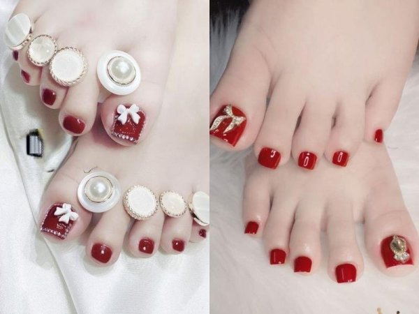 Mẫu nail chân màu đỏ đính charm nơ xinh xắn (Nguồn: Lục Diệu Linh, TốUyênNail.Design – Pinterest) Các mẫu nail chân màu đỏ đính charm nơ đá lấp lánh, phù hợp để bạn diện trong các buổi tiệc (Nguồn: thegioilamdep.vn, Na Nails Academy Cần Thơ – Pinterest)Nail chân màu đỏ vẽ họa tiết