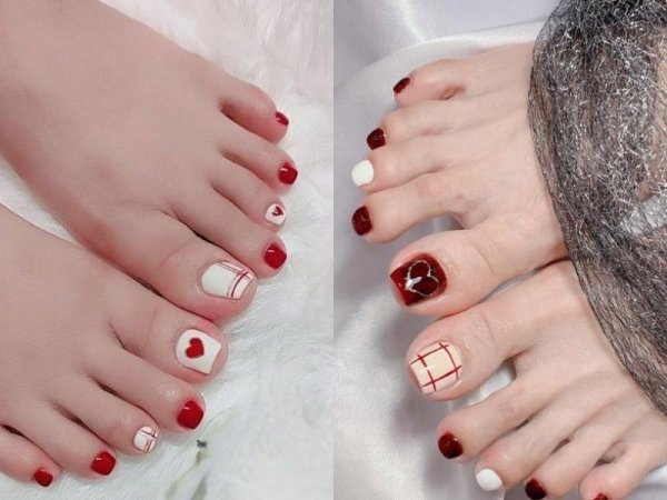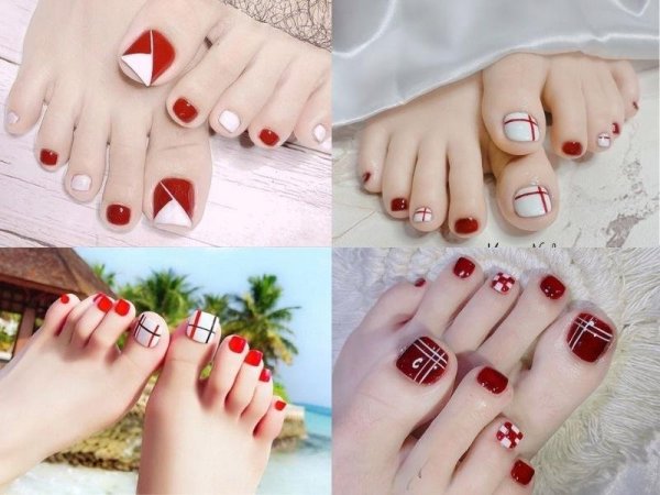 Nail chân kết hợp giữa hai màu trắng và đỏ sẽ giúp bạn trông nổi bật và thu hút hơn (Nguồn: ngọc huế beauty, Nail Dương Hoa – Pinterest) Bạn có thể sơn xen kẽ móng trắng và đỏ hoặc vẽ họa tiết trên móng (Nguồn: Hằng phạm, Vanthidieu, Tink Nail – Pinterest)Mẫu nail chân màu đỏ họa tiết caro
