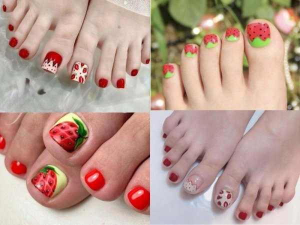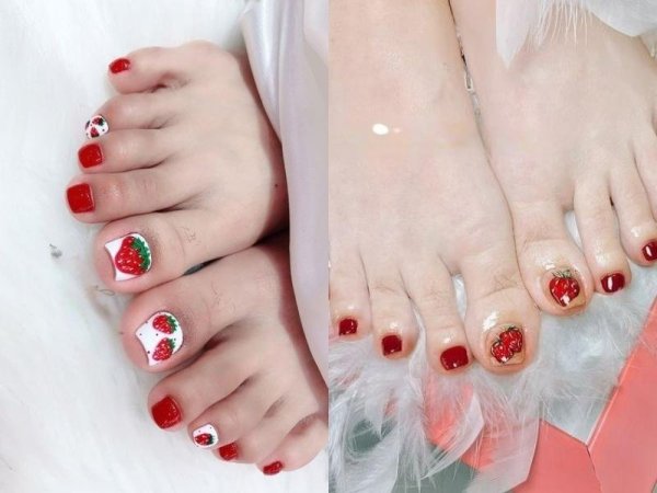 Kiểu nail màu đỏ phối họa tiết dâu tây sáng tạo là một trong những mẫu móng tay đẹp 2023 (Nguồn: Thu Nguyên, Tink nail, a, tttrang – Pinterest) Bạn có thể tạo ra các họa tiết dâu tây theo các màu sơn gel đỏ tươi sáng và ngọt ngào (Nguồn: Nail Thục Hiền – Pinterest)Các mẫu móng chân màu đỏ kẻ sọc