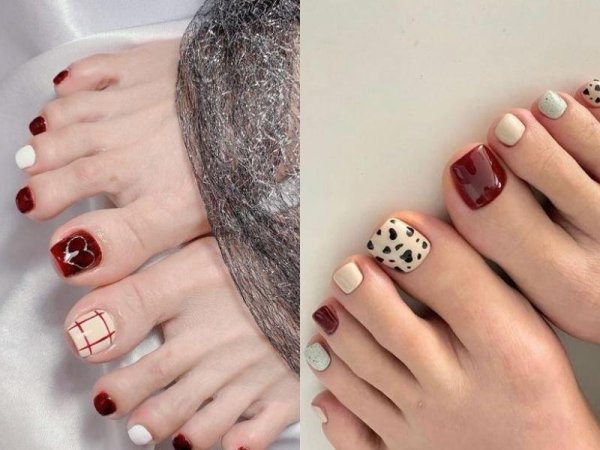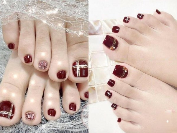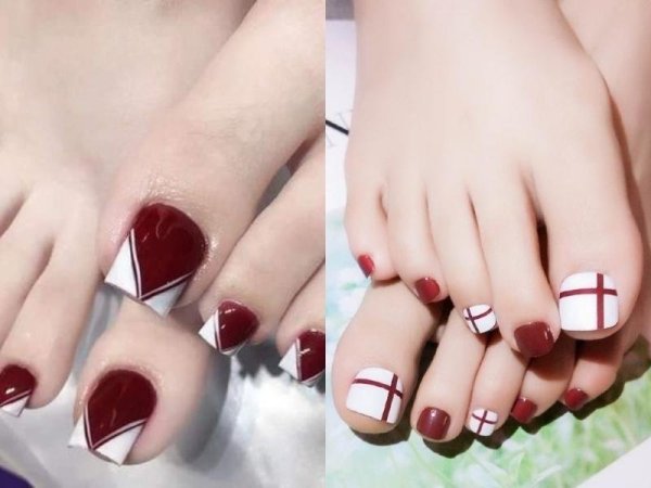 Sơn móng chân màu đỏ rượu là một sự chọn lựa vừa quý phái vừa quyến rũ. (Nguồn: beaudy.vn và Fofosbeauty) Nail chân màu đỏ rượu phối cùng màu trắng và vẽ họa tiết (Nguồn: instagram.com, a, Giàu nails – Pinterest)Sơn móng chân màu đỏ mận