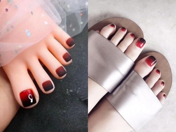Nail chân màu đỏ ombre là một kiểu móng chân màu đỏ cực kỳ thịnh hành được nhiều bạn trẻ yêu thích. Mẫu nail này có hiệu ứng loang màu sắc từ đậm đến nhạt hoặc ngược lại, tạo nên sự độc đáo và cuốn hút cho đôi chân của bạn. Bạn có thể chọn kết hợp các màu hồng, đỏ nhạt hoặc nâu để loang cùng màu đỏ. Ngoài ra, bạn có thể thêm một vài điểm nhấn nhỏ như vẻ viền trắng, đính kim tuyến sẽ giúp bộ nail của bạn thêm xinh xắn, nổi bật.