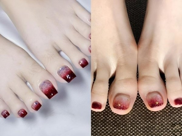 Nail chân màu đỏ ombre là một kiểu móng chân thịnh hành được nhiều bạn trẻ yêu thích. (Nguồn: nailbox.vn) Mẫu nail này có hiệu ứng loang màu sắc từ đậm đến nhạt hoặc ngược lại, tạo nên sự độc đáo và cuốn hút (Nguồn: Huế Trân, tttrang – Pinterest)Mẫu móng chân màu đỏ phủ kim tuyến