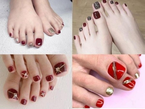 Các mẫu nail màu đỏ phối màu xinh xắn (Nguồn: lamdepmoingay.com.vn, IMEN, anna – Pinterest)Sơn móng chân màu đỏ rượu phối màu bạc, vàng