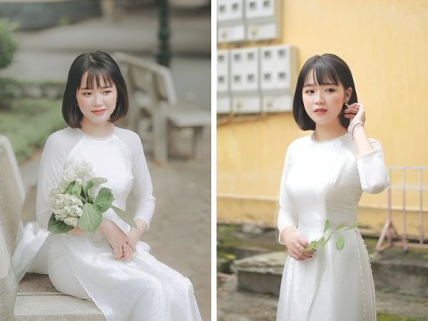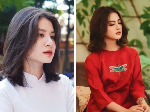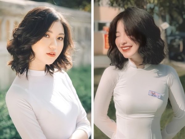 Những cô nàng tóc ngắn cũng có thể mặc những chiếc áo dài phong cách dịu dàng, thanh lịch nếu để tóc ngắn ngang vai uốn gợn sóng. Kiểu tóc xoăn sóng lơi nhẹ nhàng tạo đường nét mềm mại, che giấu được các khuyết điểm như hàm đầy đầy giúp bạn trẻ trung, cá tính hơn rất nhiều. Đây là kiểu tóc mặc áo dài cho học sinh được nhiều bạn trẻ lựa chọn.