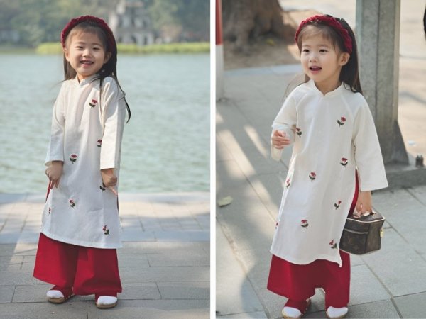 Tóc uốn và mấn không chỉ mang đến vẻ đẹp truyền thống mà còn là biểu tượng của sự tinh tế và thanh lịch.(Nguồn: Long nqn-Pinterest, ELLE) Kiểu tóc cho bé mặc áo dài dễ thương với mấn nhỏ (Nguồn: aFamily)Tóc búi kết hợp băng đô