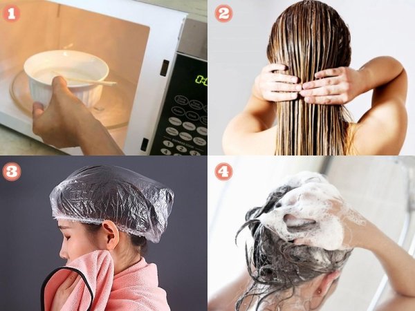 - Bước 1: Đun nóng dầu dừa (hoặc dầu olive) trong lò vi sóng ở nhiệt độ khoảng 100 độ C trong 30 giây. Nếu bạn không có lò vi sóng thì có thể dùng nồi hấp để làm nóng dầu.