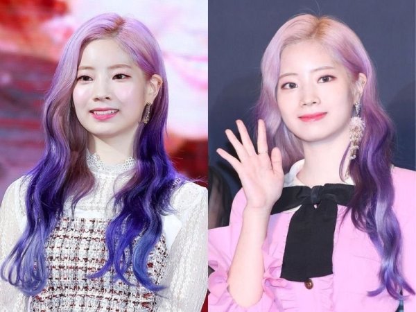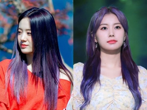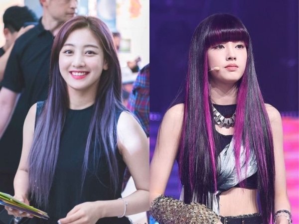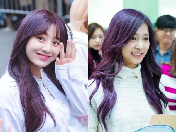 Tóc tím violet hiện đại và thanh lịch (Nguồn: Jihyo – Pinterest, Tzuyu – Pinterest)