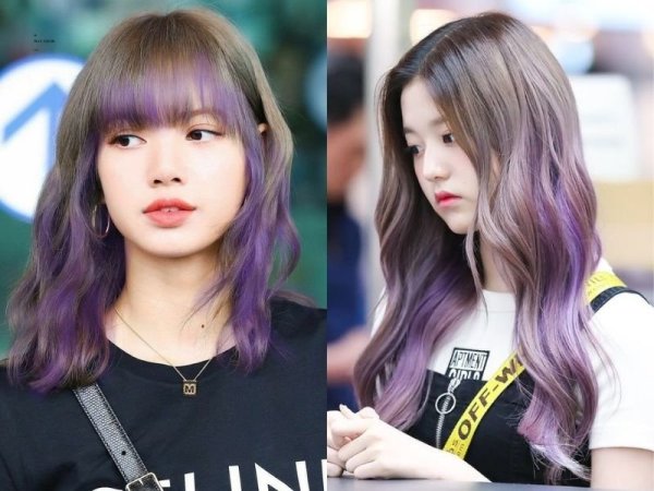 Tóc highlight tím nổi bật nhưng không quá sáng chói (Nguồn: Lisa – Pinterest, Wonyong – Pinterest)