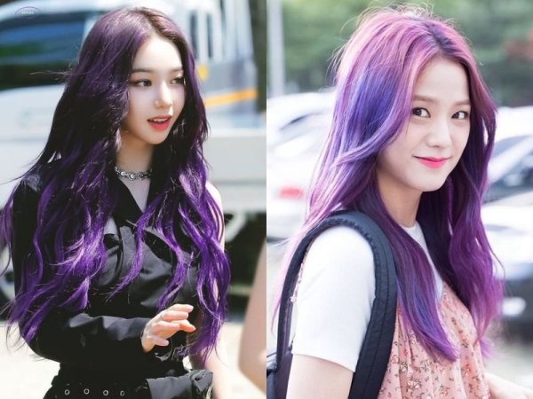 Tóc màu tím trà mang phong cách vừa nhẹ nhàng vừa nổi loạn (Nguồn: Karina – Pinterest, Jisoo – Pinterest)