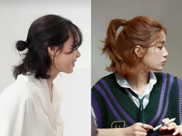 Buộc nửa đầu sẽ giúp tạo điểm nhấn và tăng thêm phần độc đáo cho kiểu mái bay tóc ngắn. Bạn có thể tạo kiểu bằng cách lấy một ít tóc và buộc gọn gàng phía sau bằng dây thun nhiều màu, scrunchies hoặc nơ cài tóc xinh xắn. Kiểu tóc buộc nửa đầu kết hợp mái bay sẽ làm nổi bật đường nét khuôn mặt, đồng thời tạo hiệu ứng mặt thon gọn cực tốt. Ngoài ra, kiểu tóc này còn đem lại vẻ ngoài nhẹ nhàng xen lẫn chút năng động, phù hợp với mọi dịp khác nhau, đặc biệt là các buổi picnic hoặc dạo phố.