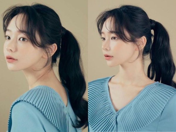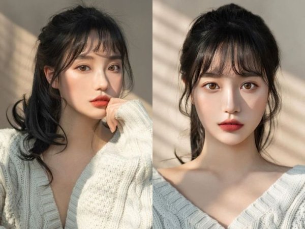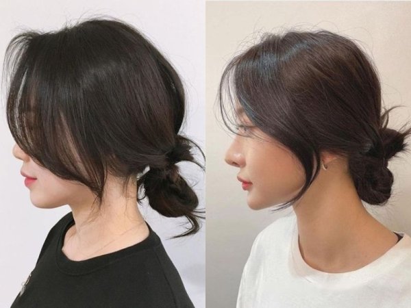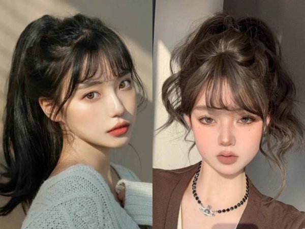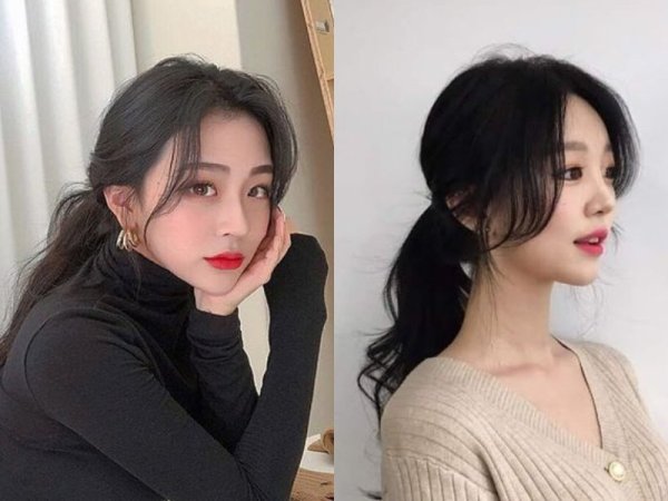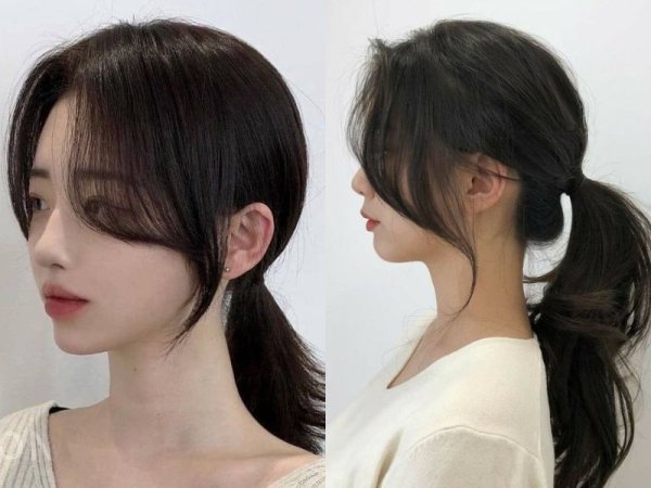 Tóc buộc thấp kết hợp mái bay layer giúp gương mặt vuông thanh thoát hơn (Nguồn: tranglamdep.net, gocphongcach.com) Tóc buộc thấp mái bay đẹp (Nguồn: kbeautyaddiction.com)Kiểu tóc buộc đuôi ngựa với mái thưa cho mặt vuông
