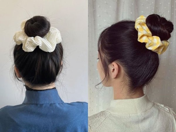 Kiểu tóc búi cao sẽ khiến mawjtg vuông lộ khuyết điểm nhưng nếu kết hợp tóc mai uốn hai bên, gương mặt của bạn sẽ trông thanh thoát hơn rất nhiều (Nguồn: linhnga.vn) Bạn có thể dùng brunchies để cố định kiểu tóc buộc cao (Nguồn: m.shein.com, voh.com.vn)Kiểu buộc tóc đuôi ngựa với thắt bím cho mặt vuông