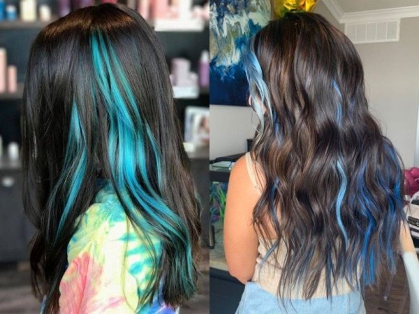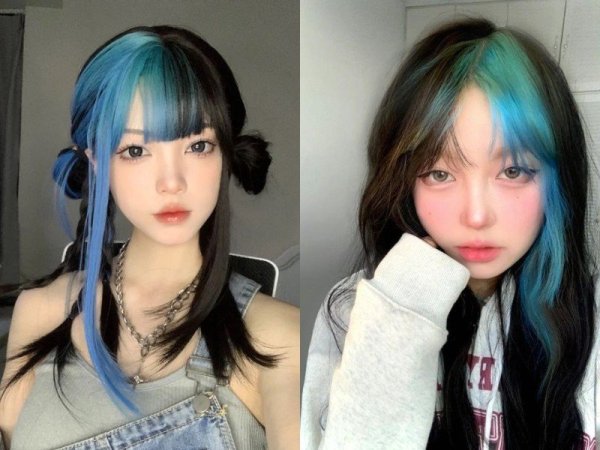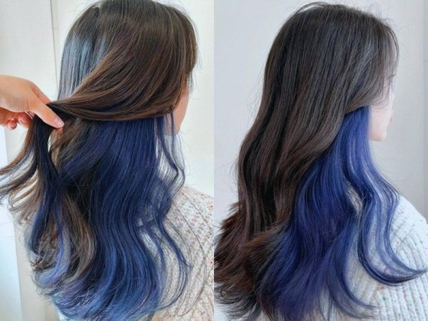 Kiểu tóc hidden nhuộm xanh khói độc lạ và cá tính (Nguồn: Melani) Giống như cái tên “hidden”, bạn có thể dễ dàng “giấu” phần tóc nhuộm xanh khói đi bằng cách xõa tóc (Nguồn: kbeauty addiction)Tóc split hair xanh khói