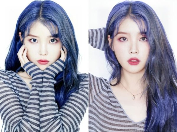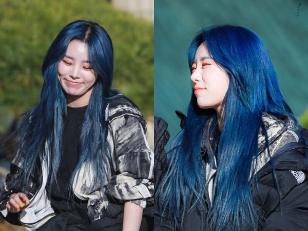Tóc xanh dương khói uốn xoăn rực rỡ như những cơn sóng đại dương (Nguồn: Fansite happiness) Tóc nhuộm xanh dương ánh khói đặc biệt nổi bật khi được ánh sáng chiếu vào (Nguồn: Fansite happiness)Màu tóc xanh khói ánh tím