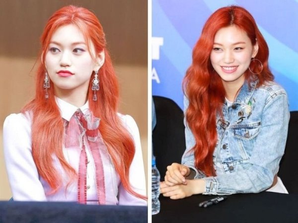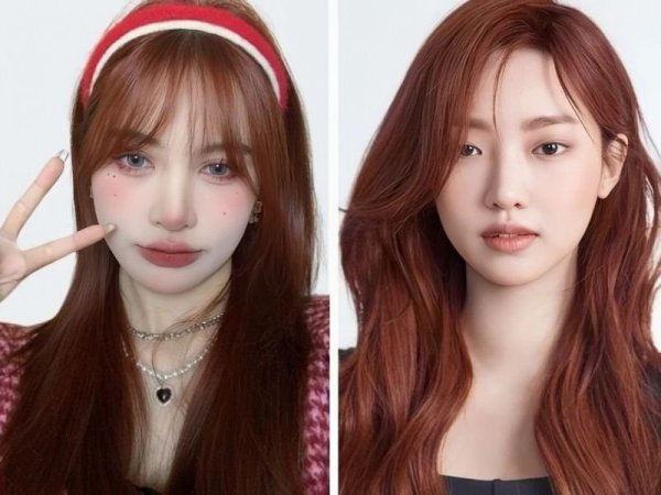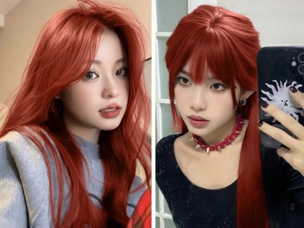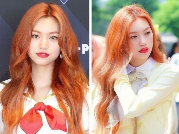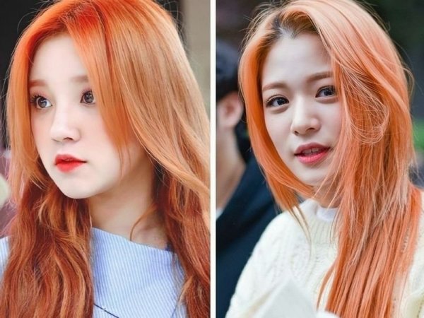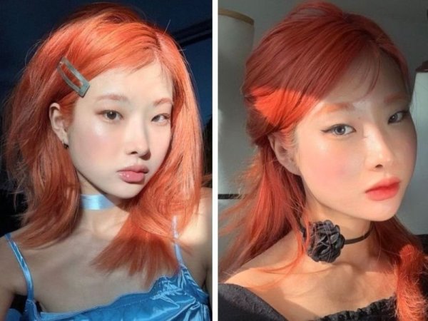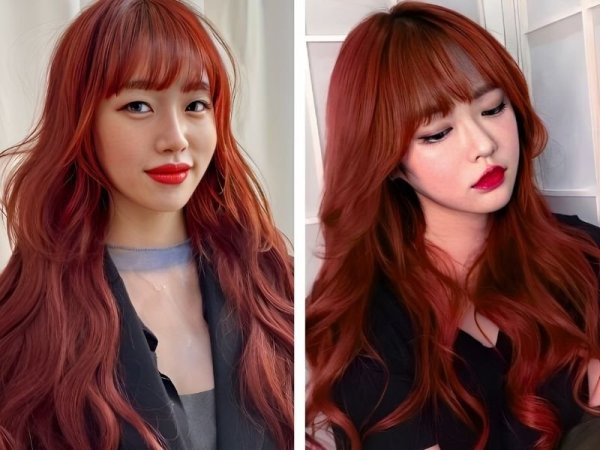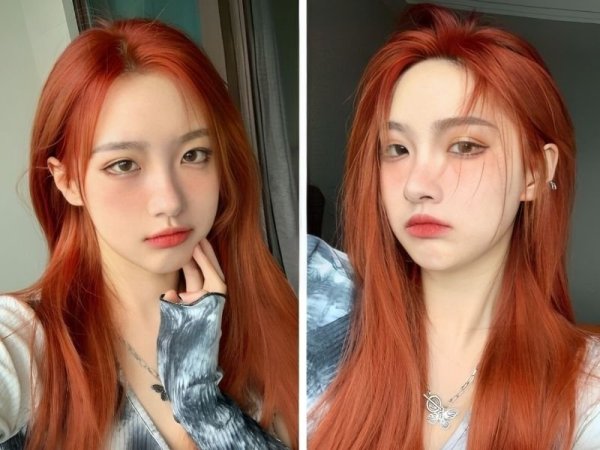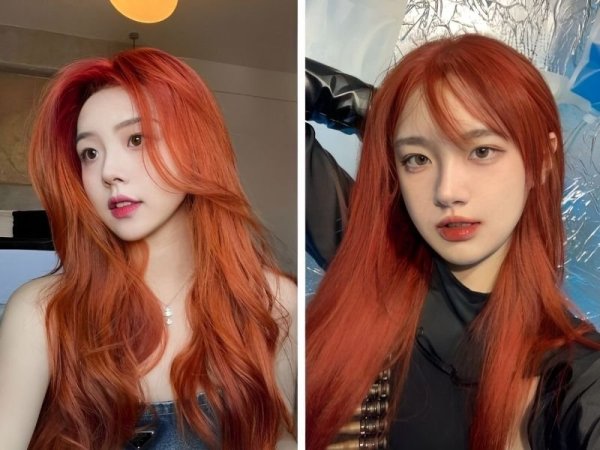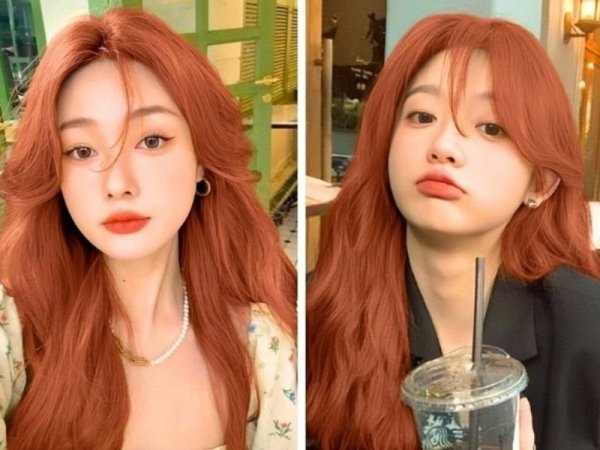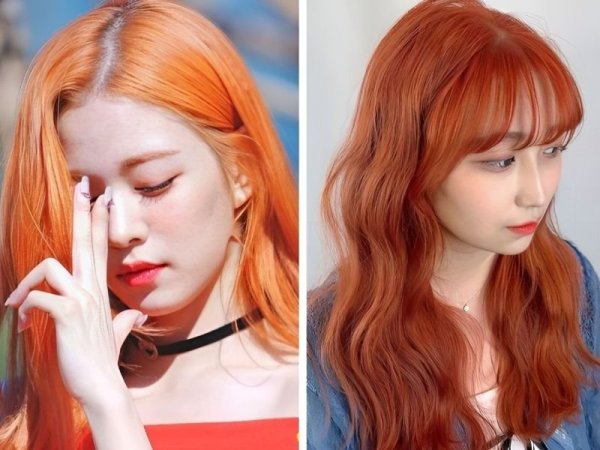 Màu nhuộm đỏ cam kết hợp với kiểu tóc uốn đuôi mang lại diện mạo rạng rỡ cho bạn (Nguồn: ◌⃘-Pinterest, Thuần Tư-Pinterest) Tóc màu đỏ cam cháy giúp bạn trông rạng rỡ hơn (Nguồn: KPOP SOURCE, aFamily)Tóc đỏ cam trầm