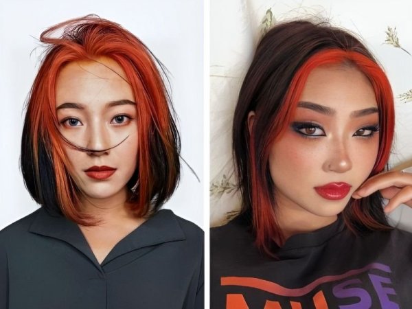 Đây là sự lựa chọn hoàn hảo cho các cô nàng cool ngầu (Nguồn: Eithan-Pinterest, ℝ𝕚𝕟𝕟𝕖~~♡-Pinterest) Màu tóc này có thể kết hợp với nhiều kiểu tóc khác nhau giúp bạn trông nữ tính hơn (Nguồn: Mystery Lover-X, UriStore-Pinterest)Nhuộm tóc highlight màu đỏ cam