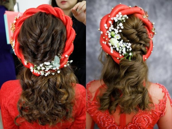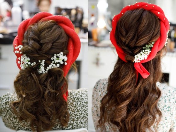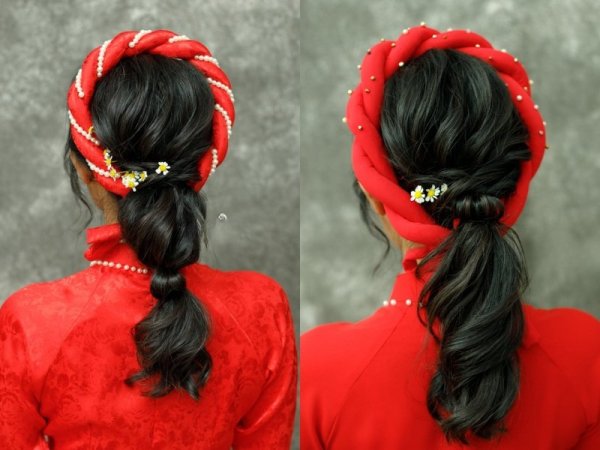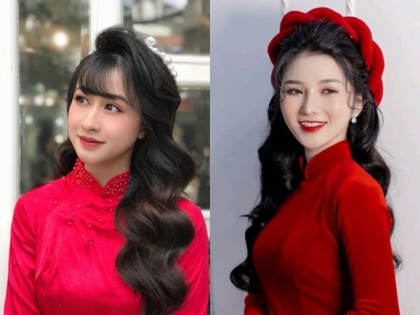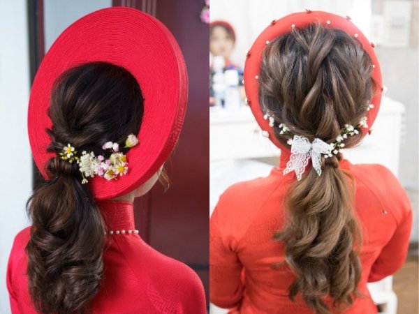 Đây cũng là kiểu tóc dành cho cô dâu mặc áo dài khá đơn giản, phù hợp với nhiều kiểu gương mặt nhưng không kém phần nổi bật trong ngày trọng đại. Phần tóc được buộc gọn kết hợp tạo kiểu đánh phồng chân tóc giúp gương mặt nhỏ gọn, thanh tú hơn. Phần tóc xõa thường được uốn gợn sóng, tạo nên sự nổi bật và vẻ đẹp sang trọng cho nàng dâu. Kiểu tóc này phù hợp với cả mọi kiểu áo dài truyền thống và cách tân nhẹ nhàng. Trong lễ ăn hỏi, bạn có thể chọn cho mình kiểu áo dài trắng thuần khiết, còn trong lễ ăn cưới thì có thể diện áo dài đỏ nổi bật kết hợp các loại hoa cài tóc để thêm điểm nhấn nhé.