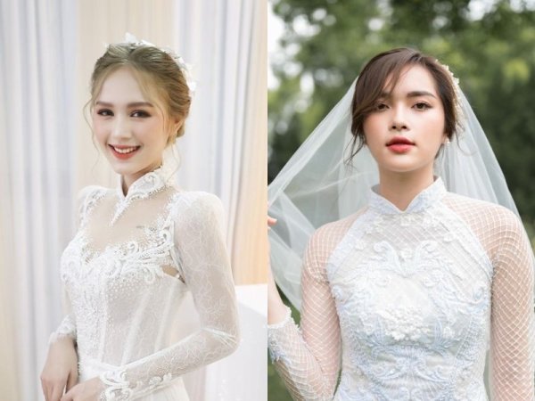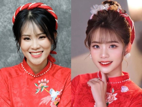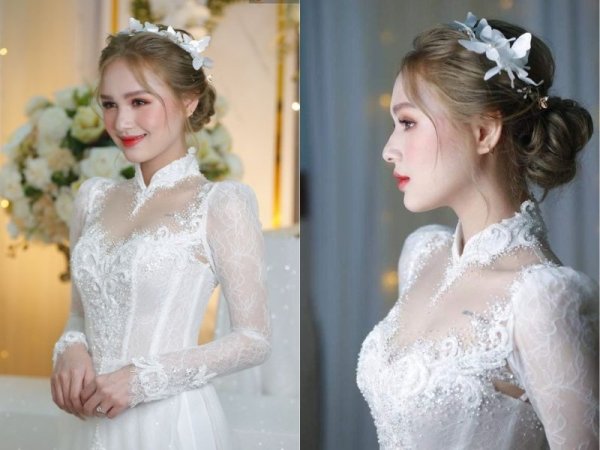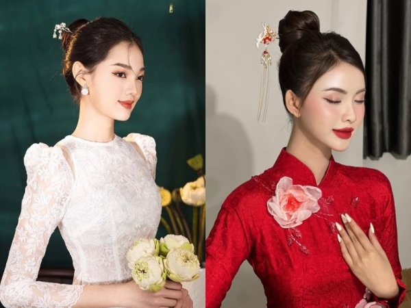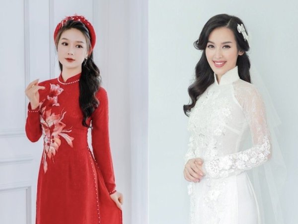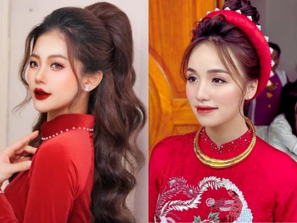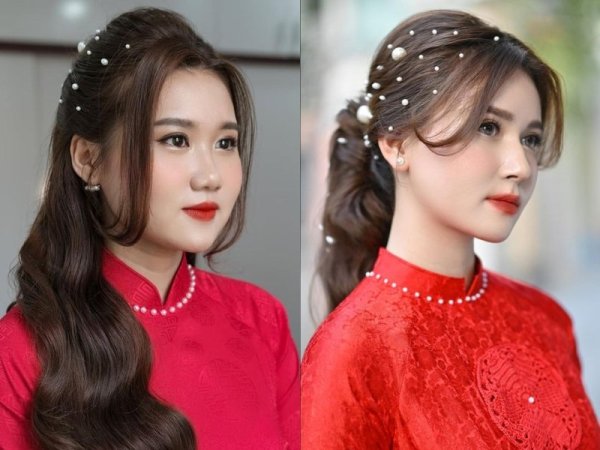 Kiểu tóc cô dâu buộc nửa đầu mặc áo dài đỏ tạo cảm giác thanh lịch, nữ tính lại dễ tạo kiểu (Nguồn: hocnghetoc.edu.vn) Kiểu tóc buộc nửa đầu đơn giản, gọn gàng kết hợp áo dài trắng thuần thiết cho các nàng dâu trong lễ ăn hỏi (Nguồn: Ta Da Wedding – Pinterest, Đỗ Thị Hà – Facebook)Kiểu tóc mặc áo dài cưới uốn gợn sóng