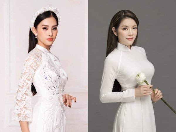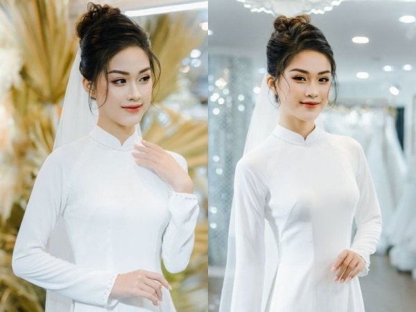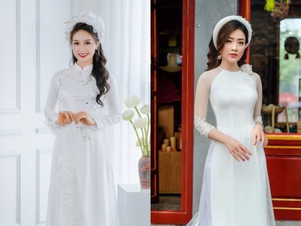Tóc cô dâu búi cao cài voan trong áo dài trắng cực kỳ duyên dáng, thướt tha (Nguồn: mariebridalhcm – Pinterest) Bạn có thể chọn kiểu áo dài và voan cùng màu kết hợp tóc tối màu để tổng thể hài hòa, nổi bật (Nguồn: lavaha.vn, aodaicoba.vn)Kiểu tóc cô dâu mặc áo dài cài hoa