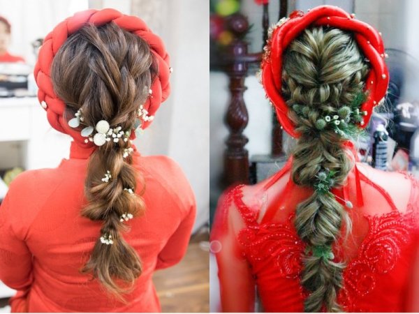 Kiểu tóc tết độc đáo, duyên dáng cũng là một lựa chọn tuyệt vời cho các nàng dâu khi diện các kiểu áo dài cưới truyền thống trong ngày cưới. Thông thường tóc tết cô dâu mặc áo dài được tết sẽ kèm với dây hoa hoặc được đính những bông hoa lên tóc. Nhờ đó, kiểu tóc này sẽ tạo nên vẻ đẹp thơ mộng và duyên dáng cho các nàng dâu. Kiểu tóc cô dâu mặc áo dài đội mấn này sẽ giúp tổng thể gọn gàng hơn nhưng vẫn giữ được nét nữ tính, ngọt ngào. Bạn nên chọn những kiểu áo dài cưới có các họa tiết nổi tổng thể đồng nhất khi chọn kiểu tóc này nhé.