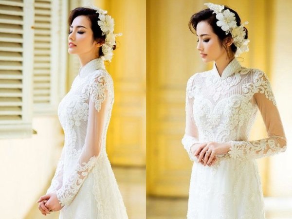 Trang phục áo áo dài cài voan là sự kết hợp hài hòa giữa phong cách truyền thống và hiện đại. Những tấm voan mỏng tạo nên vẻ đẹp thướt tha, duyên dáng cùng với áo dài nữ tính giúp cô dâu xinh đẹp hơn trong ngày trọng đại. Với kiểu cài voan, bạn có thể chọn búi tóc cao hoặc buộc nửa đầu nhé. Ngoài ra, những tấm voan truyền thống sẽ có màu trắng hoặc màu sáng, vậy nên bạn hãy chọn áo dài cùng màu để dễ phối nhất nhé.