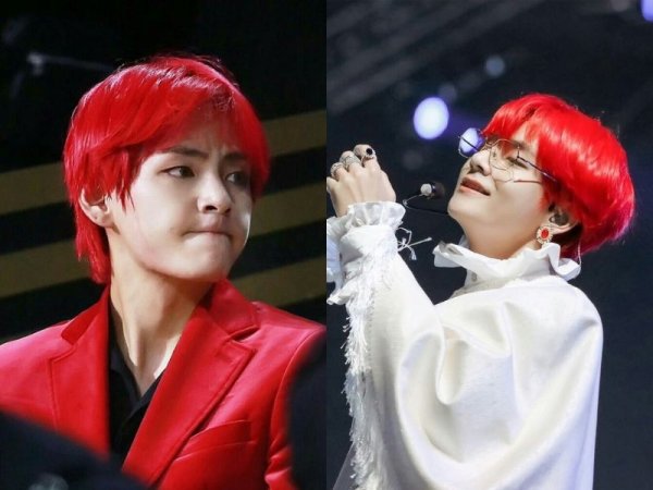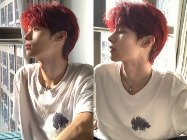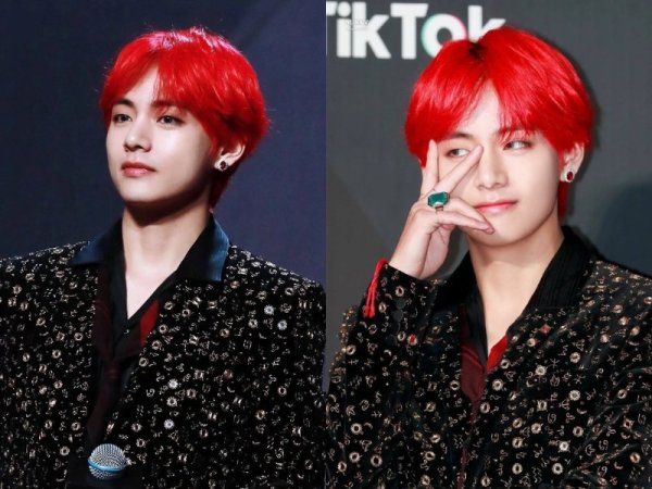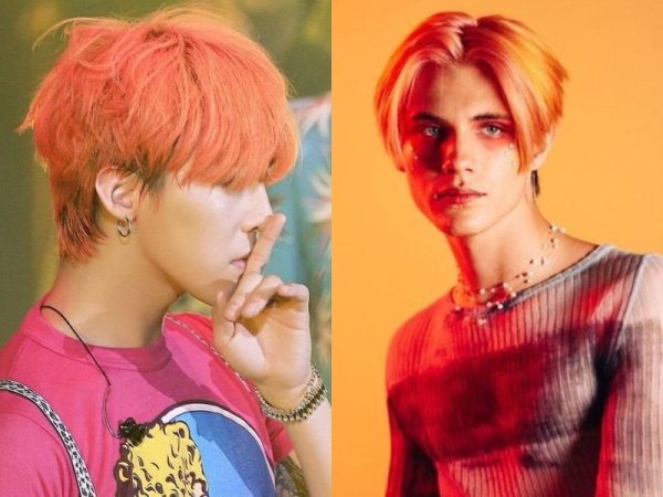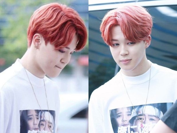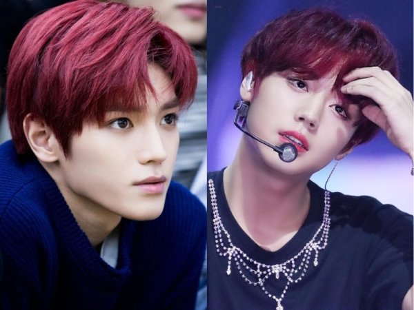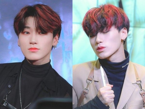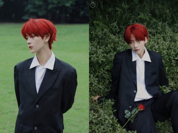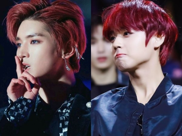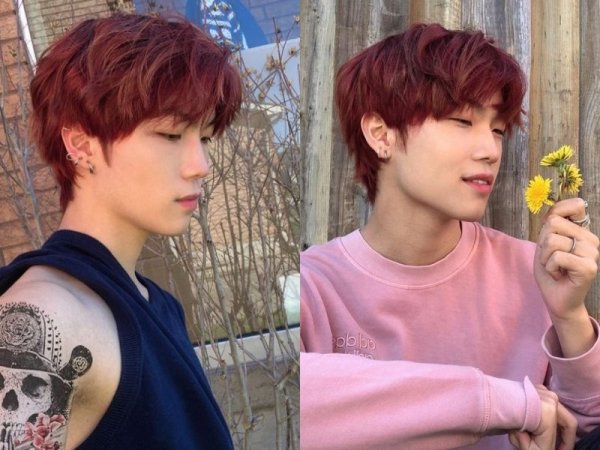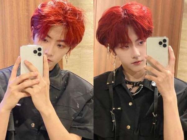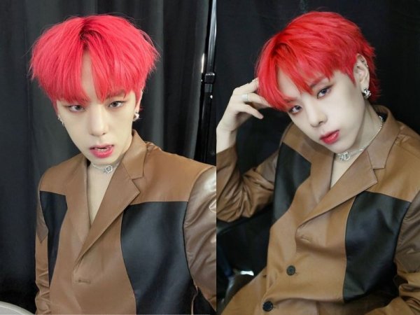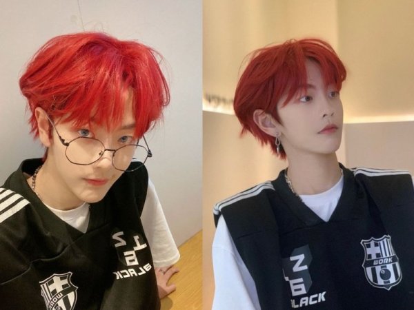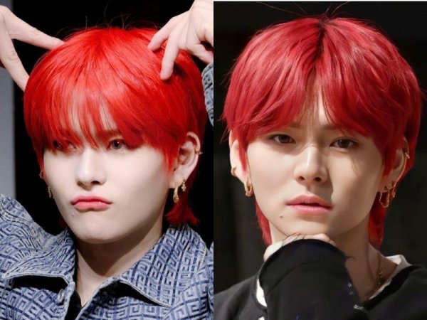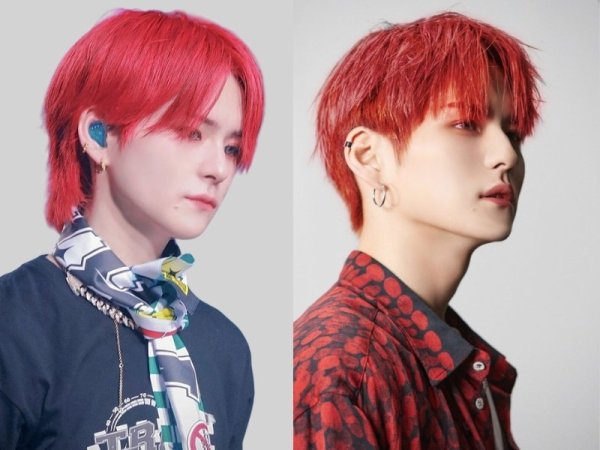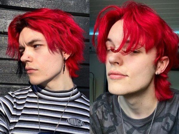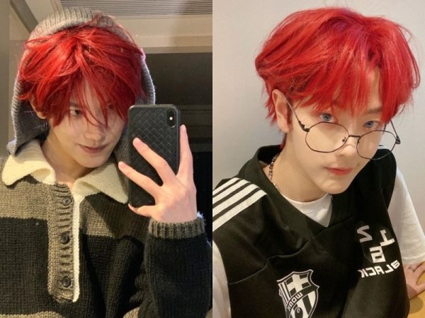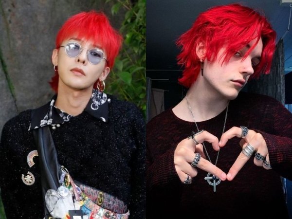 Màu tóc đỏ neon gây sốt một thời (Nguồn: Jeno00 – Pinterest và Pepay – Pinterest) Màu tóc đỏ neon thích hợp với những chàng trai da trắng (Nguồn: Yoshi và @lxvattack – Twitter)Nhuộm tóc màu đỏ mận
