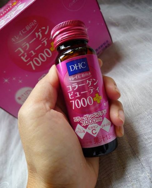 Sản phẩm có dạng nước dễ uống (Nguồn: healthygoods)Ngoài hàm lượng collagen cao, sản phẩm cũng chứa vitamin C, B2, B6 giúp nuôi dưỡng làn da tươi sáng và trẻ trung. Hơn. Thành phần không chứa chất bảo quản và hương vị đào chua ngọt dễ uống cũng là một trong những điểm cộng của Collagen de Happy. Nếu bạn đang cần một sản phẩm đem lại hiệu quả nhanh chóng thì hãy tham khảo sản phẩm này nha.*Giá tham khảo: 900k/ hộp 10 lọ.3. DHC CollagenDHC Collagen DHC Beauty 7000+Collagen DHC Beauty 7000+ là sản phẩm nuôi dưỡng da và chống lão hóa của hãng DHC nổi tiếng Nhật Bản. Ngoài việc bổ sung collagen để ngăn ngừa và cải thiện các vấn đề lão hóa sau 25 tuổi thì sản phẩm này cũng kết hợp bổ sung vitamin C giúp da sáng, đều màu hơn và thu nhỏ lỗ chân lông.