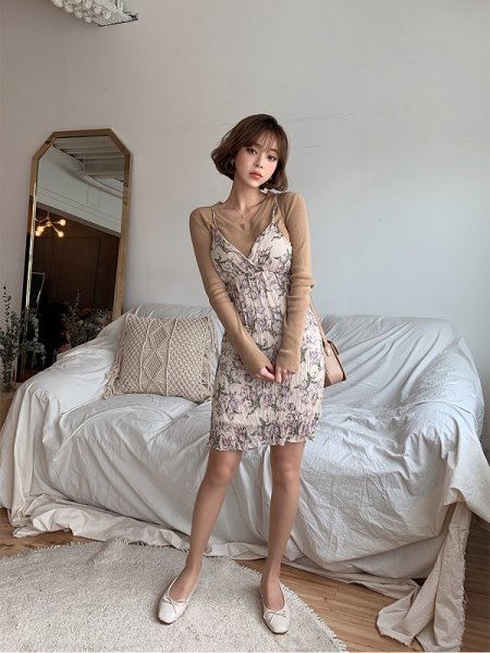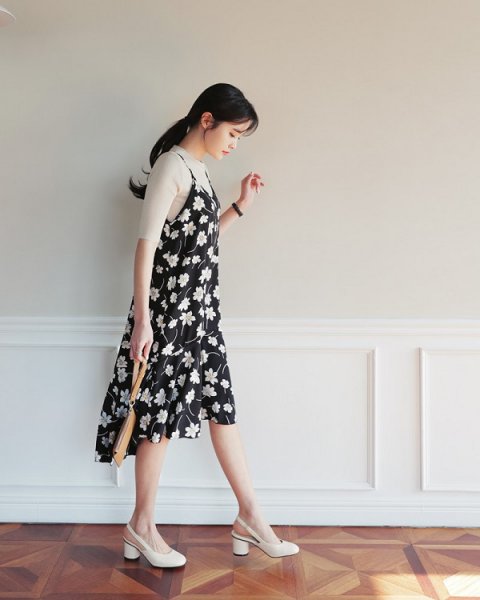 Sự kết hợp giữa áo len tay dài và váy liền hoa này đủ khiến bạn cảm nhận được mùa xuân chưa? (Nguồn: Chuu.com)