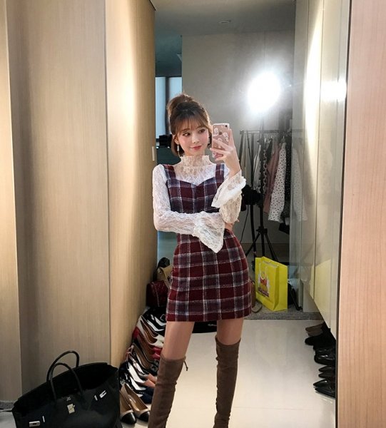 Nếu phối với áo len tay dài đem lại cảm giác thanh lịch thì áo len tay ngắn tay sẽ đem đến cảm giác trẻ trung hơn (Nguồn: Chuu.com)Áo tay loe được cách điệu kết hợp với váy liền caro sẽ đem đến cho nàng một phong cách trẻ trung, năng động nhưng không kém phần nữ tính và thanh lịch