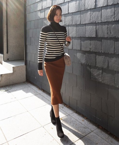 4. Áo len điệu kết hợp chân váyDường như vẫn là sự kết hợp đơn giản nhưng đầy cuốn hút và duyên dáng. Các nàng có thể phối áo len cổ cao hoặc áo len cách điệu với tất cả mọi loại chân váy mà không sợ sến súa và phức tạp.Có lẽ, chân váy dài ngang gối đang là hot trend vào những ngày Tết sắp đến? Môt sự kết hợp thông minh khi phối với áo len cổ cao sọc ngang thế này. Các nàng có thích kiểu phối hợp này không?