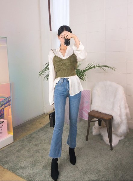 Bạn cũng có thể diện nguyên combo này với jean ống loe với boots. Sự phối hợp này đem lại một phần trẻ trung cho các nàng đấy! ( Nguồn: Chuu.com)