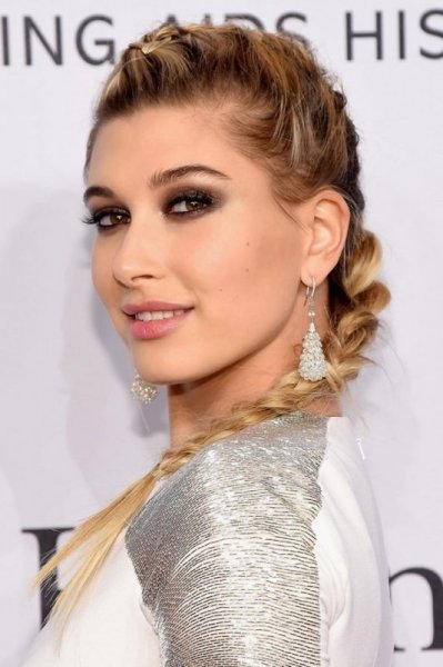 Mái tóc tết rối kiểu Pháp rất phù hợp với cách trang điểm mắt khói của Hailey Baldwin.