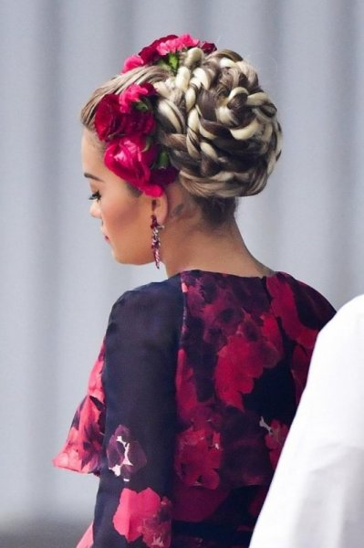 Một kiểu búi tóc tết xoắn ấn tượng khác của Rita với 2 gam màu đối lập cùng rất nhiều hoa hồng.