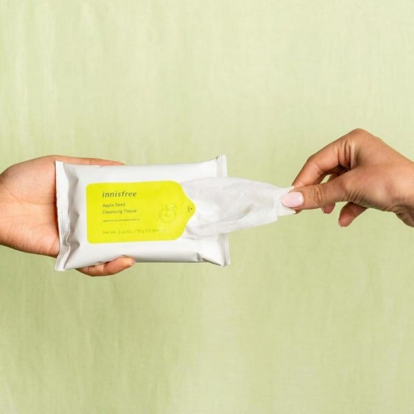 Khăn tẩy trang giúp làm dịu da Innisfree (Nguồn: Internet)Sản phẩm khăn ướt tẩy trang Innisfree Apple Seed Cleansing Tissue được chiết xuất từ dầu hạt táo giúp làm dịu da và bổ sung các chất chống oxy hóa cho da. Khi sử dụng, sản phẩm không hề gây bết rít và có hương táo dễ chịu giúp bạn thư giãn và sảng khoái hơn.