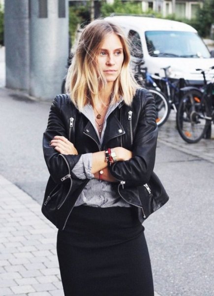 Một chiếc áo khoác da màu trắng hoặc đen mix cùng chiếc váy len ôm là sự kết hợp tuyệt vời dành cho cô nàng yêu thích phong cách năng động và mạnh mẽ. Và đừng quên kết hợp set đồ này với một đôi boots da cá tính để trang phục hoàn hảo hơn nhé.