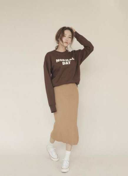 Một công thức mix and match tuyệt vời nữa các cô nàng yêu thích sự trẻ trung, năng động là chân váy len dài kết hợp với áo thun dài tay. Áo thun luôn là 1 item không thể thiếu trong tủ đồ của mỗi cô gái. Với một chiếc chân váy len dài mix cùng chiếc áo thun dài tay hoặc ngắn tay tùy thích có form rộng sẽ mang đến cho bạn cảm giác thoải mái mà không lo bị gò bó hay sợ lộ khuyết điểm cơ thể. Set đồ này rất hợp cho các bạn sinh viên mặc đến trường trong tiết trời mùa thu dịu mát.